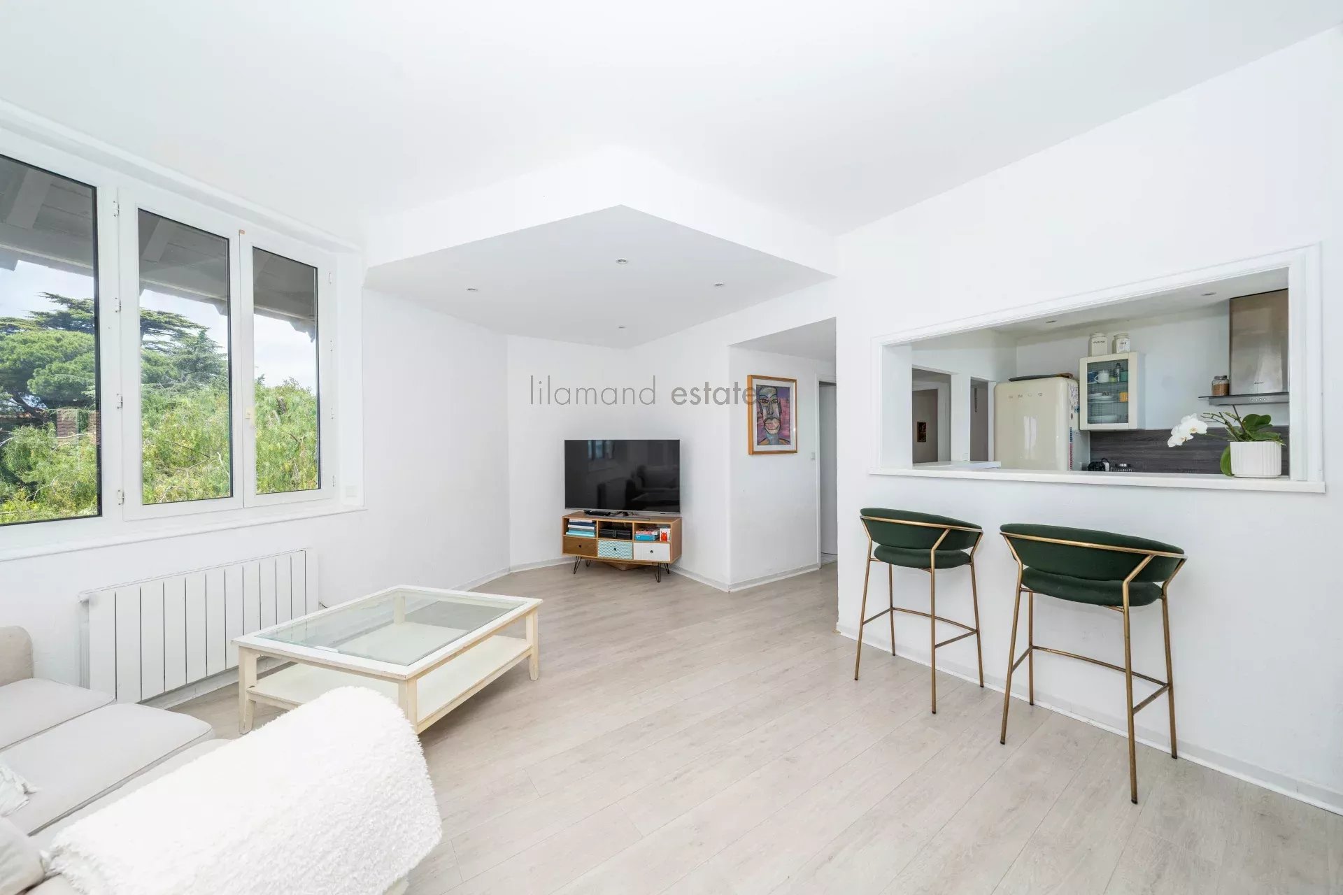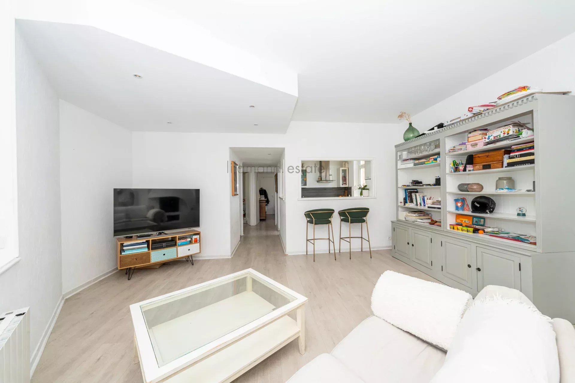 L'agencement de l'appartement comprend une entrée, un séjour spacieux et lumineux, et une cuisine ouverte équipée. On y trouve également deux chambres et une salle de bains.