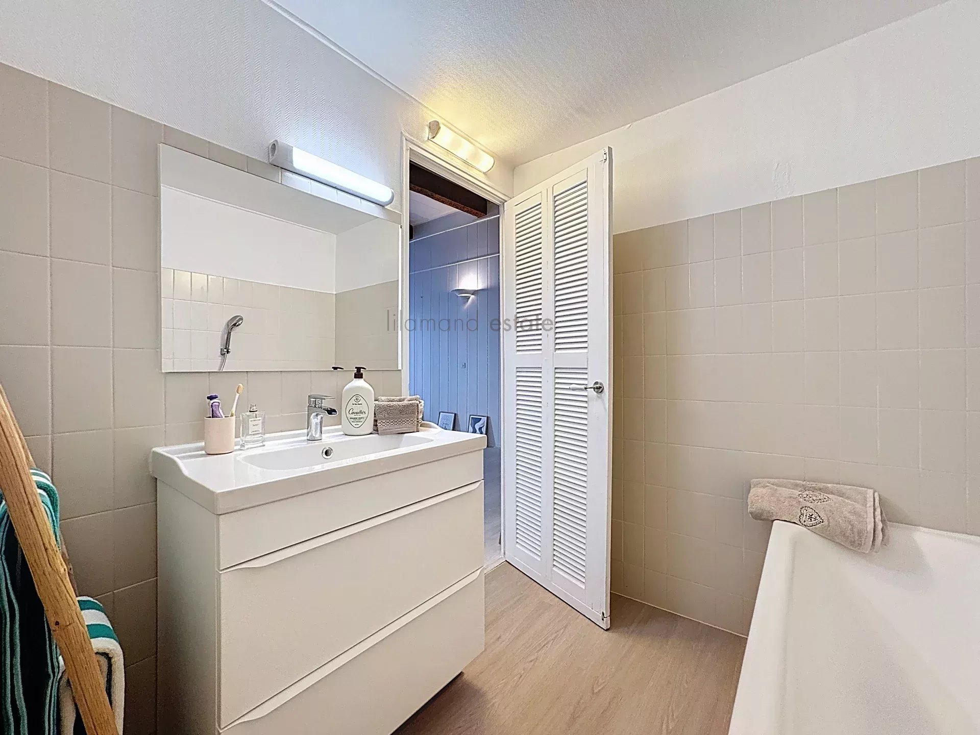 Une entrée, un séjour/ salle à manger, donnant sur un balcon de 8 m2 exposé Ouest avec une vue latérale mer , une cuisine indépendante, une chambre, une salle de bains avec WC, un dressing, ainsi qu'un WC invités.