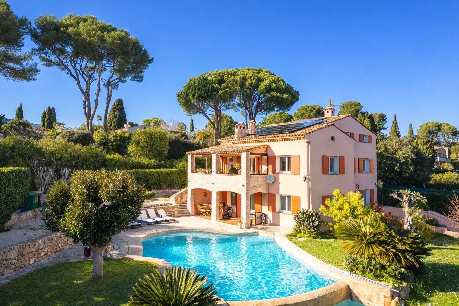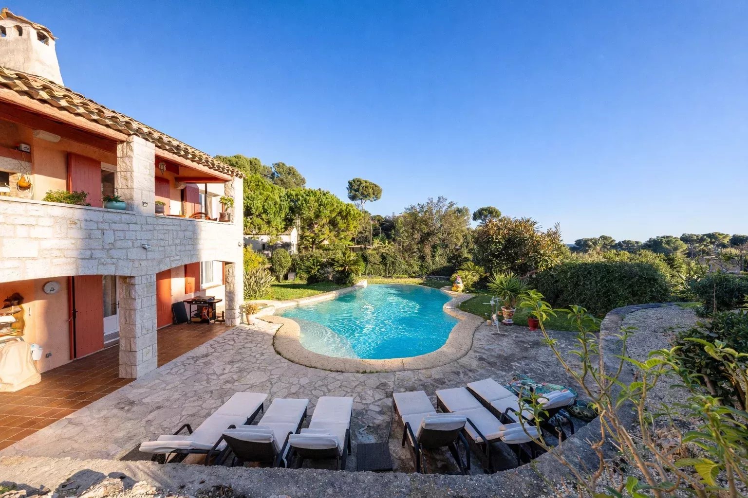 La maison dispose de prestations complètes : un garage, une cave à vin, un espace dédié aujourd’hui à l’enregistrement musical pouvant être reconverti en home cinéma, ainsi que trois pièces de vie lumineuses. Côté nuit, on retrouve six chambres, dont plusieurs avec salle d’eau privative.