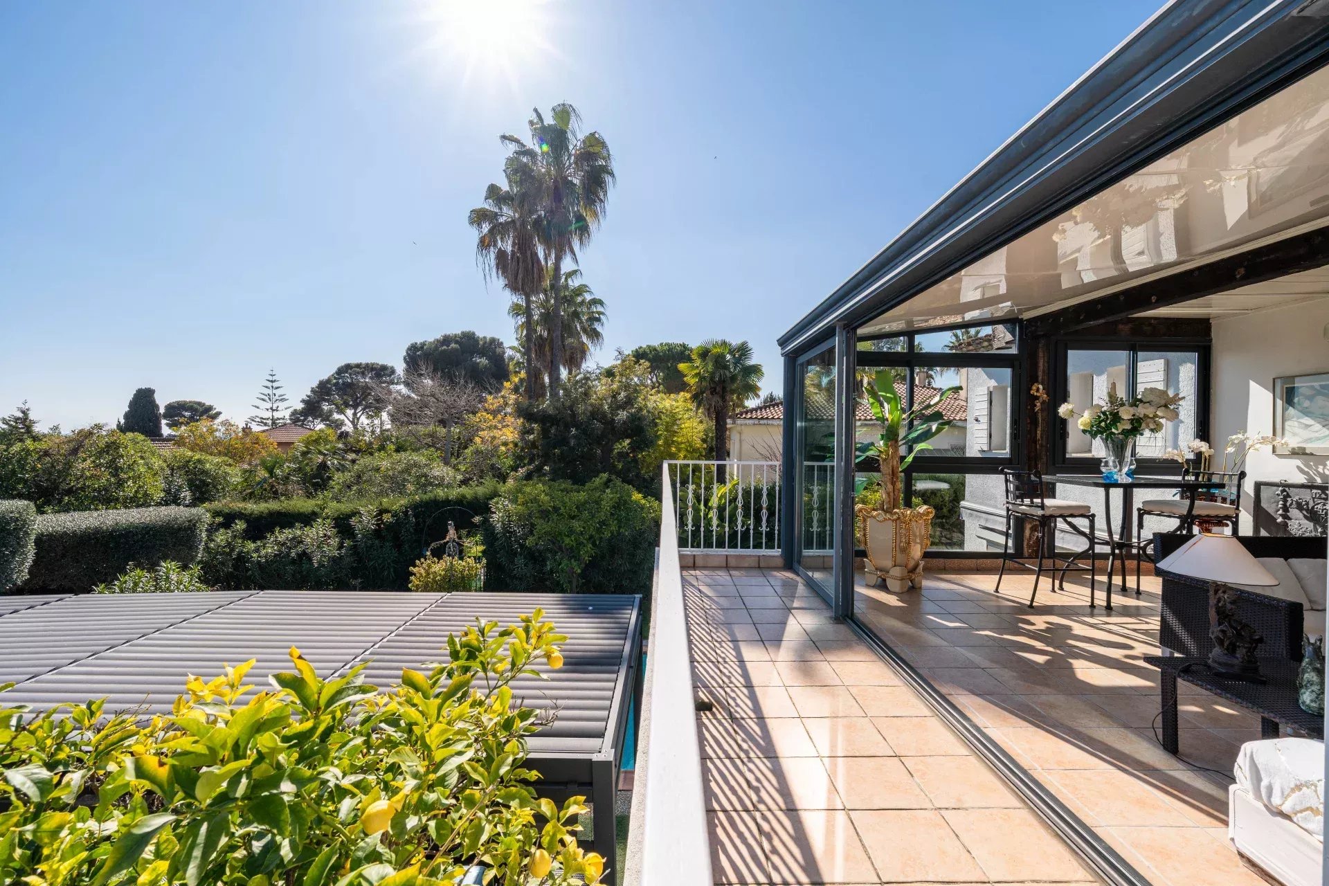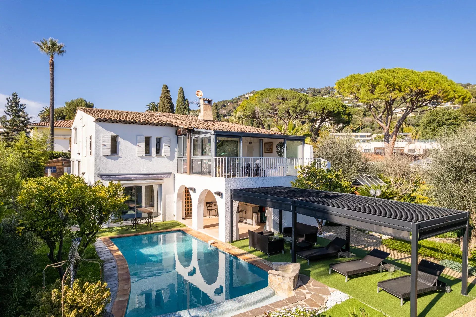 À l’extérieur, le terrain accueille des oliviers, une piscine chauffée, une pergola et abris de jardin, offrant un espace dédié aux moments en plein air.