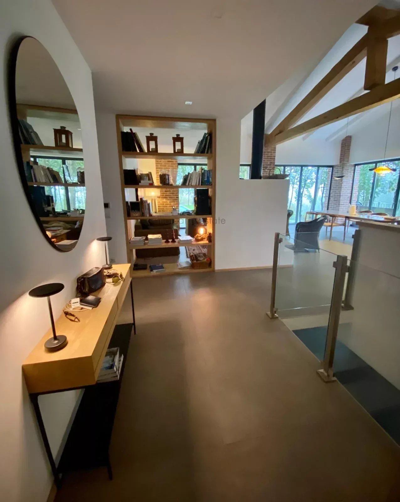 Un hall d'entrée, un double séjour/ salle à manger lumineux et ouvert avec de grandes fenêtres donnant sur la piscine et le jardin, une cuisine ouverte équipée. On y trouve également une buanderie/ laverie, une salle de sport, un bureau, ainsi qu'un WC invités.
